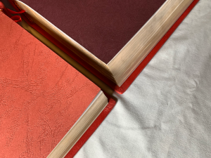 From left to right: Standard Cloth binding, Potomac Leather binding, thinner and thicker Fine bindings