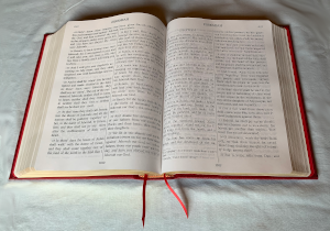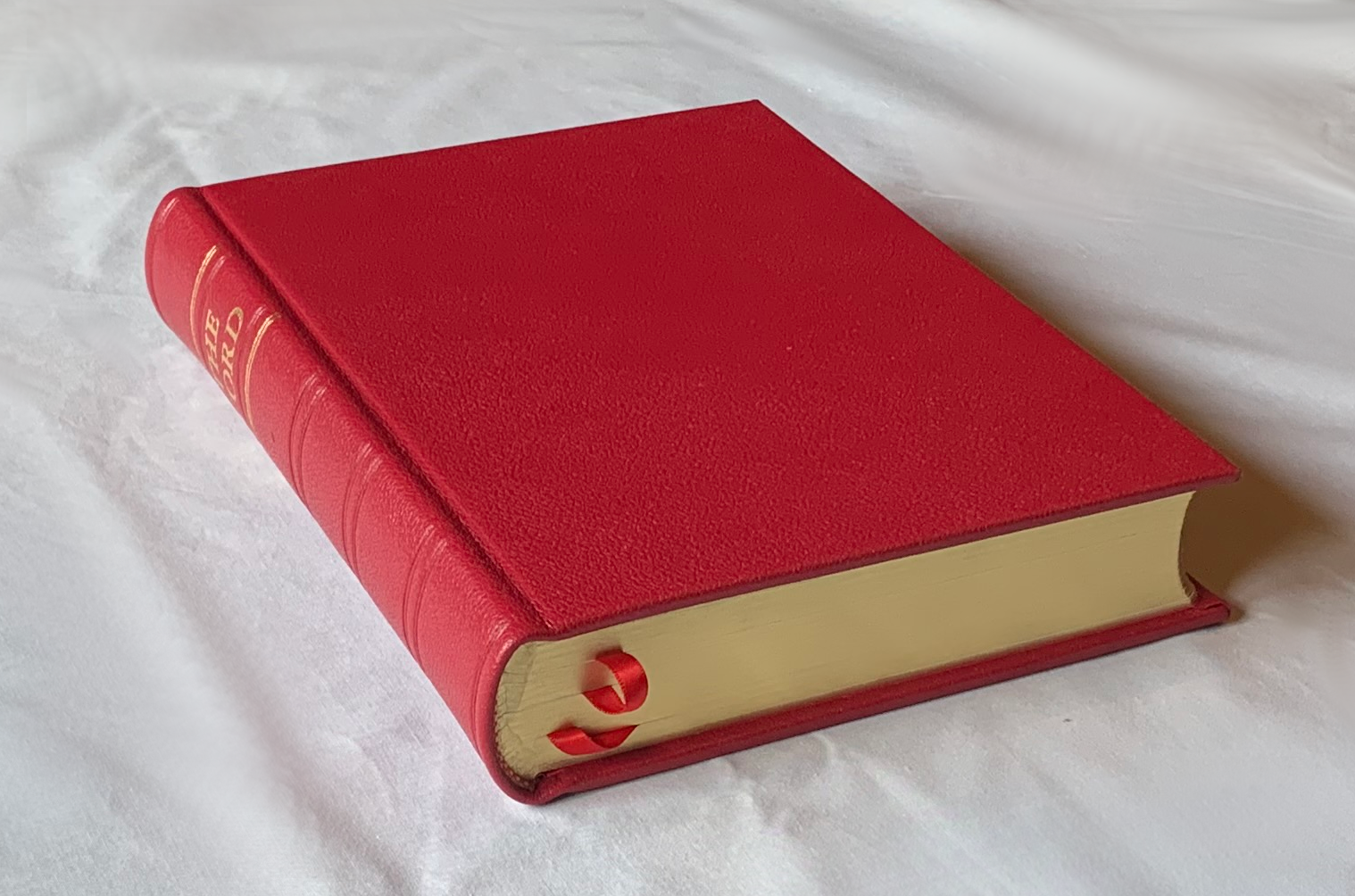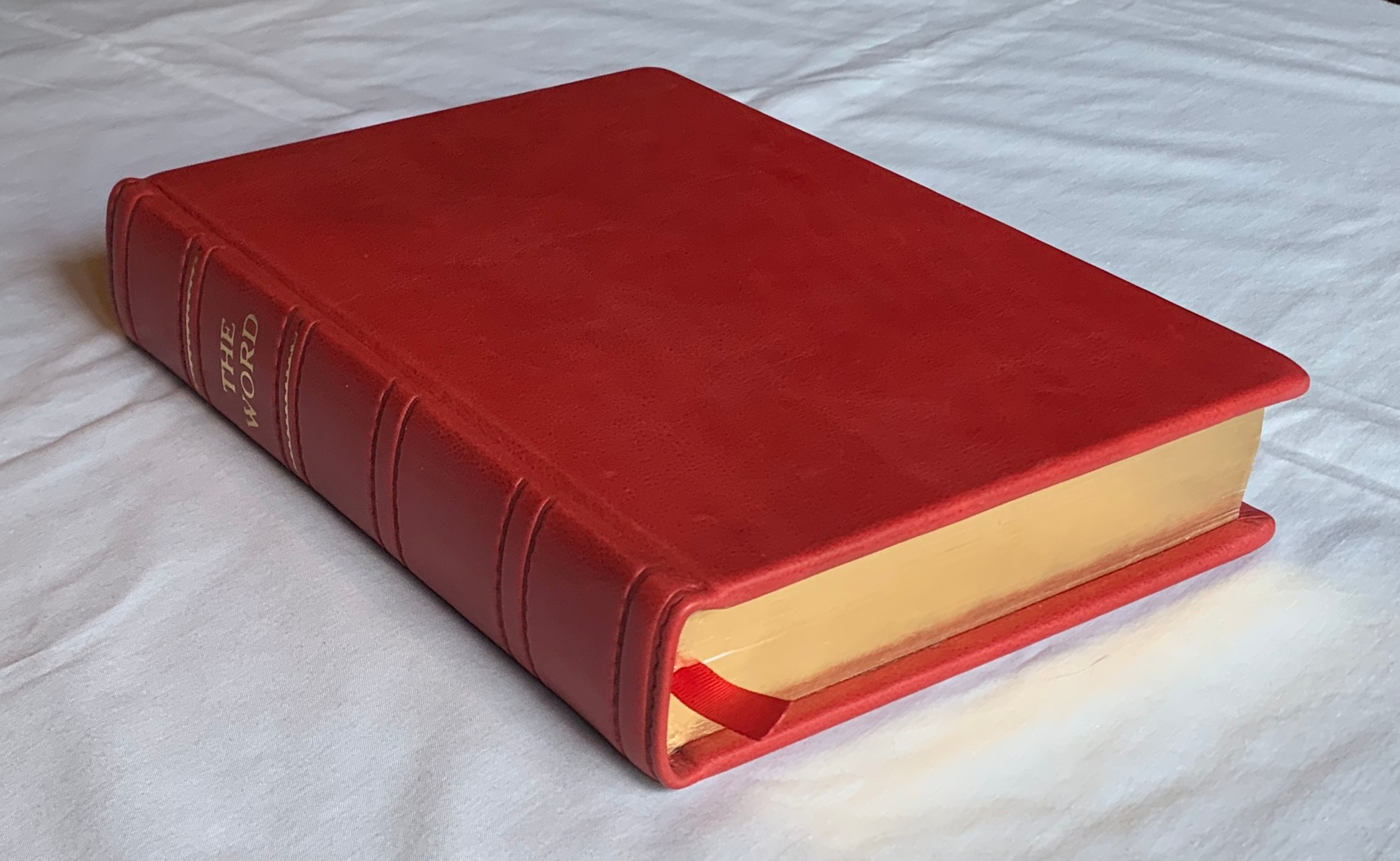 The cover is red calfskin. The spine is stamped with "The Word" in real gold. The page edges are gilded, and the page corners are rounded.