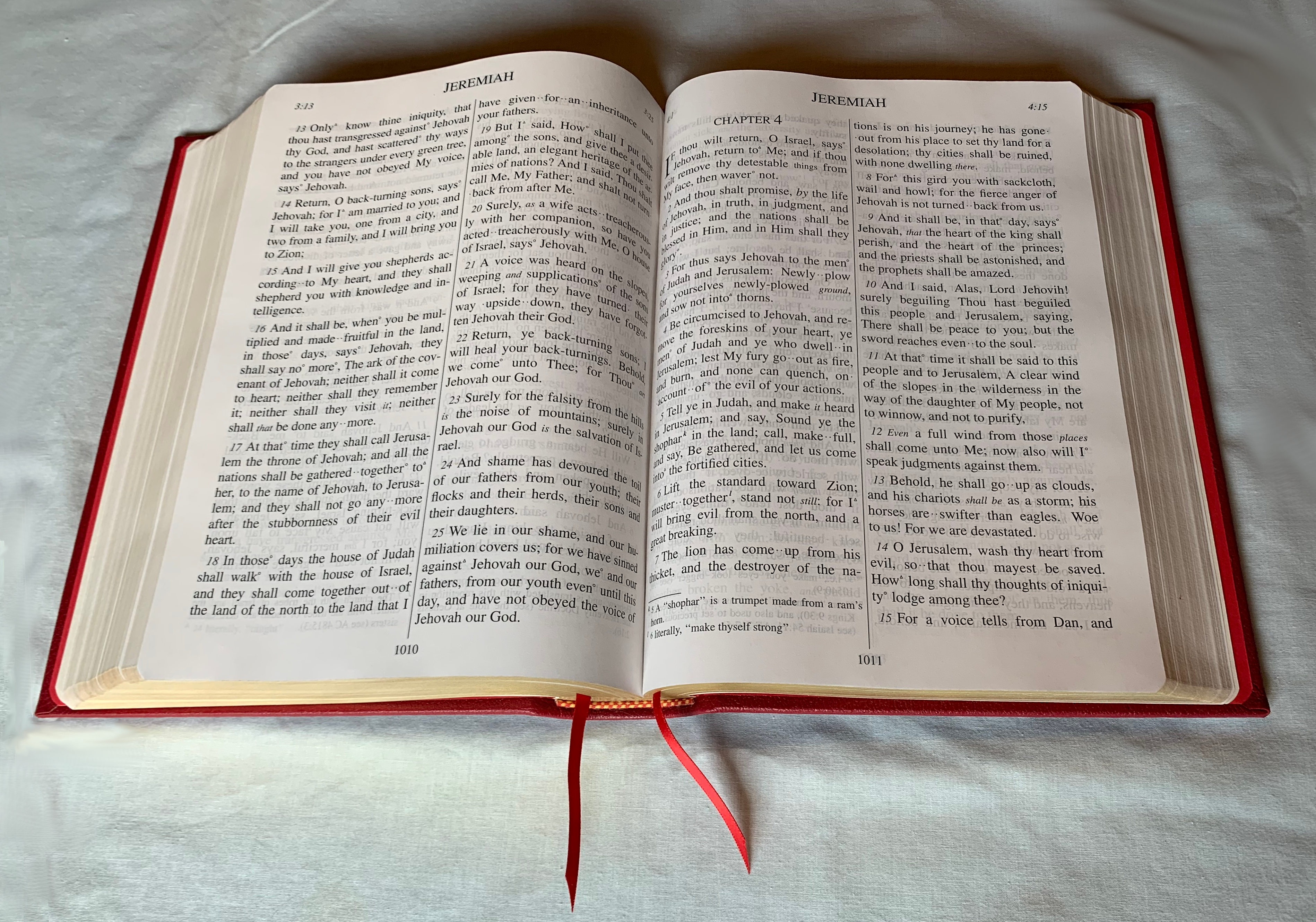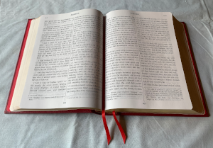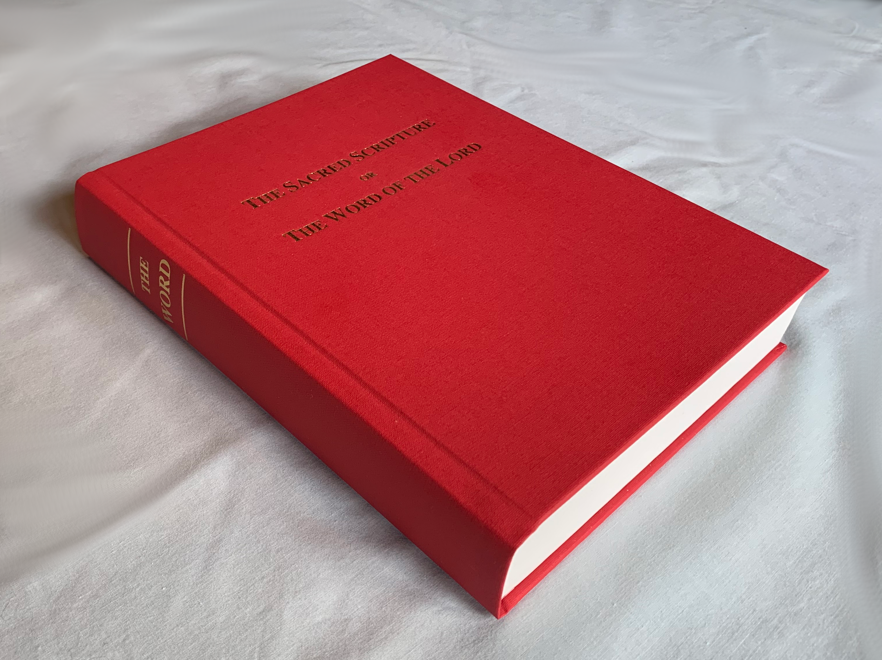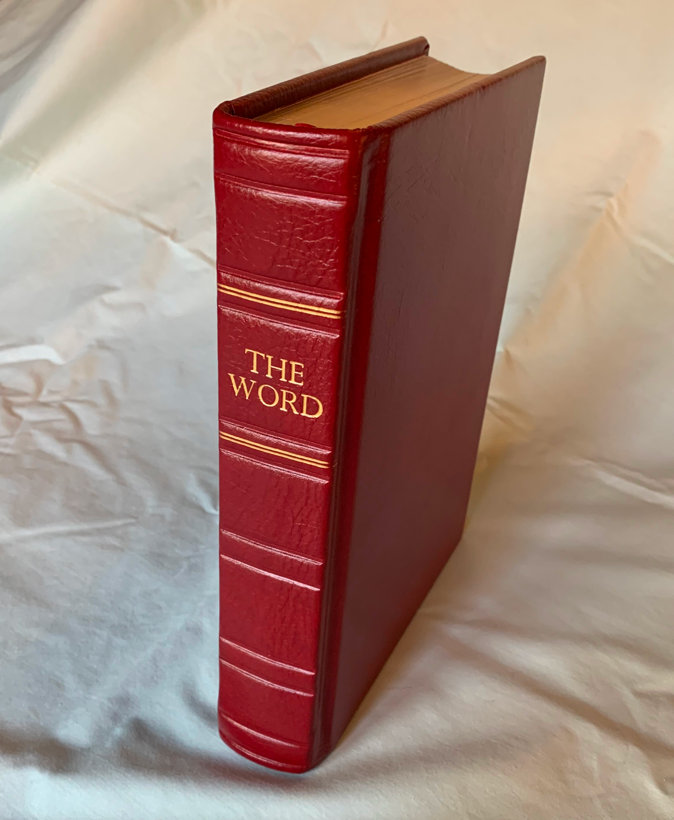 The cover is red calfskin. The spine is stamped with "The Word" in real gold. The page edges are gilded, and the page corners are square.