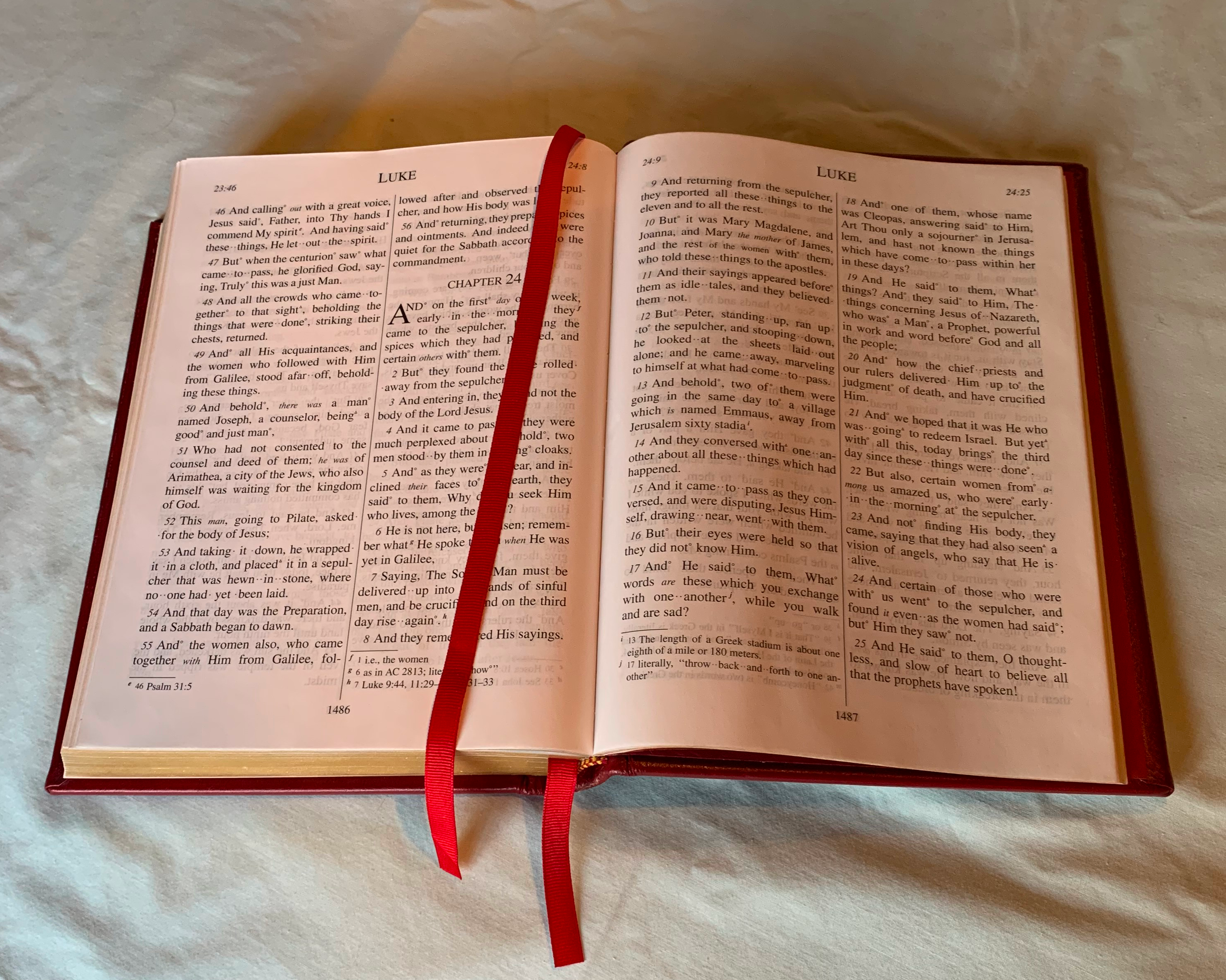 The cover is red calfskin. The spine is stamped with "The Word" in real gold. The page edges are gilded, and the page corners are rounded.